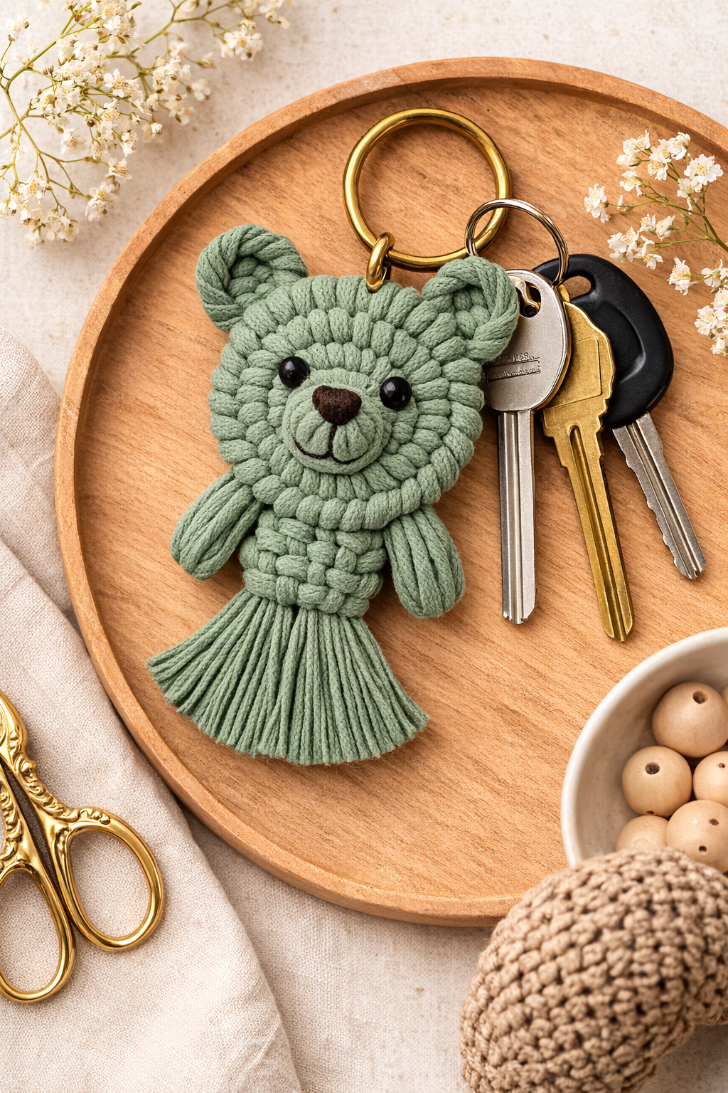 Each piece is handwoven with detailed macrame knots, giving the bear its cute shape and textured design. The sturdy metal ring ensures your keys stay secure while the lightweight design makes it easy to carry.