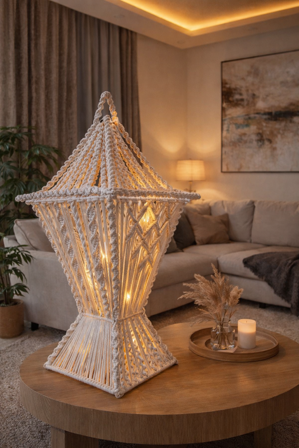 Add warmth and elegance to your space with this handcrafted macrame lantern. Designed with intricate cotton rope detailing, it creates a soft ambient glow—perfect for boho-inspired living rooms, bedrooms, and cozy corners.