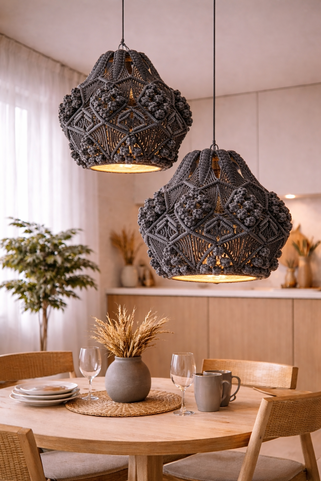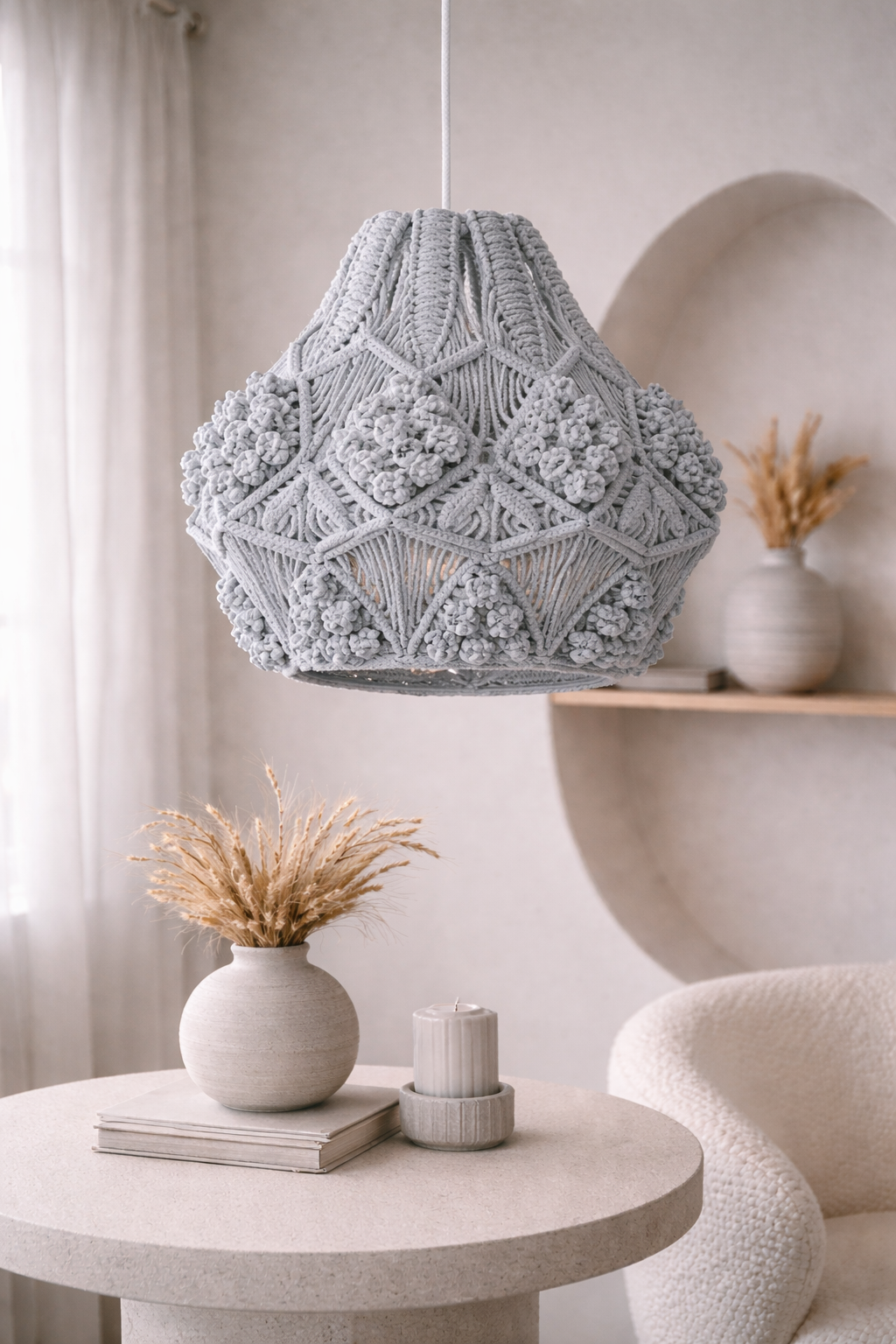 Add a touch of elegance and craftsmanship to your space with this beautifully handmade macrame pendant light. Designed with intricate knot detailing and soft textures, this piece creates a warm and inviting atmosphere.