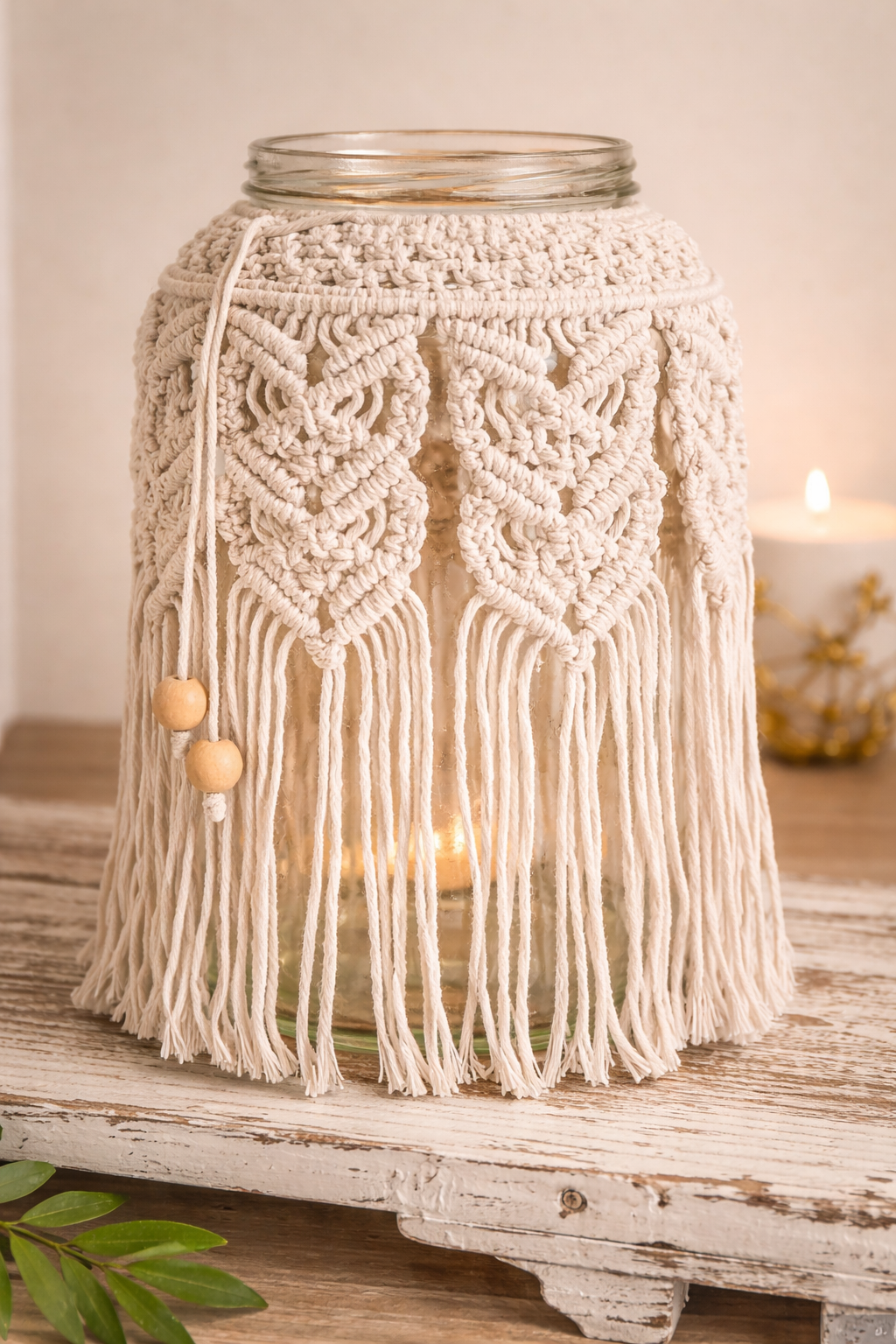 Add a warm boho touch to your home with this handmade macrame jar lantern. Crafted with premium cotton cord and elegant knot patterns, it transforms a simple glass jar into a beautiful decorative lantern.