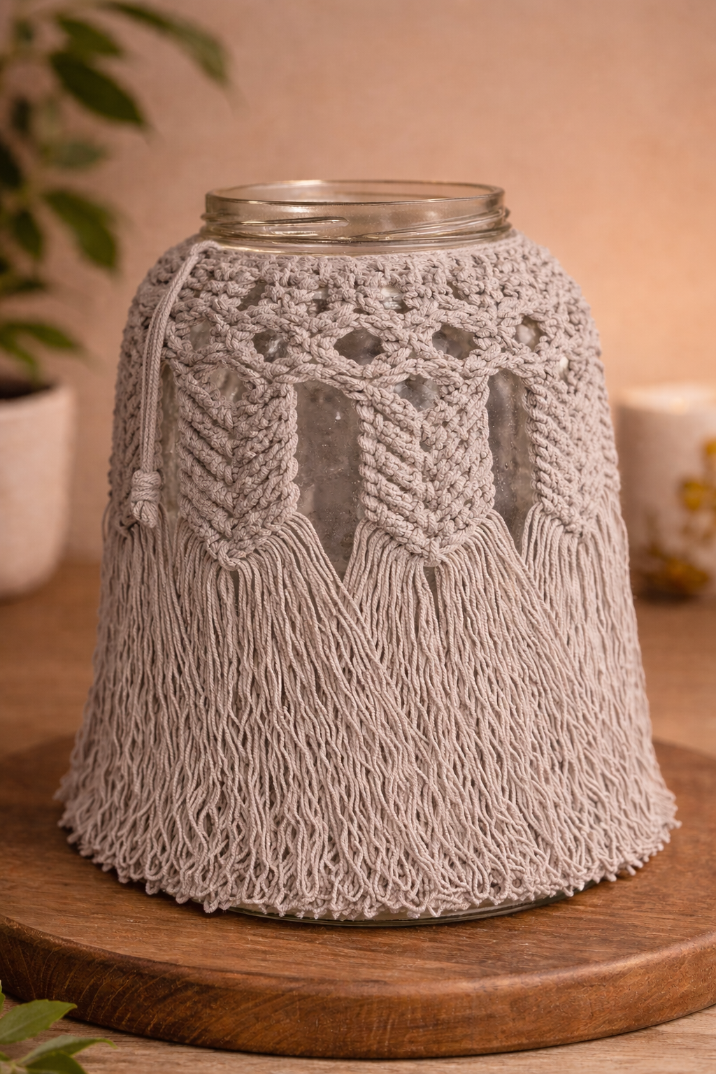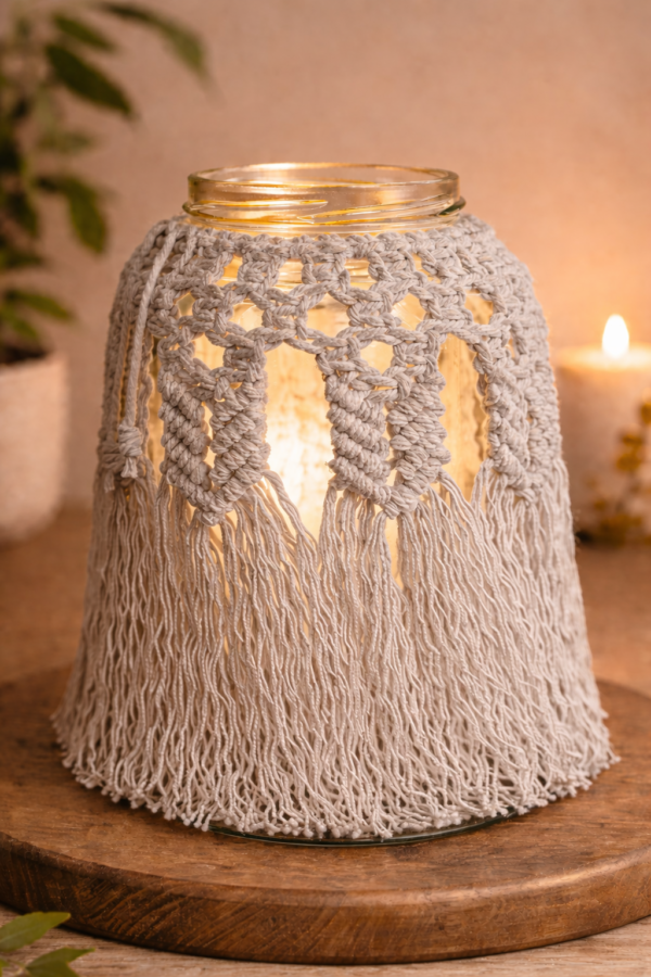 Simply place the macrame cover over a glass jar and add a candle or LED light to create a soft glowing lantern. The neutral tones blend perfectly with boho, rustic, minimalist, and modern interiors.