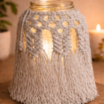 A macrame jar cover is used to decorate glass jars and turn them into stylish candle lanterns for home decor.