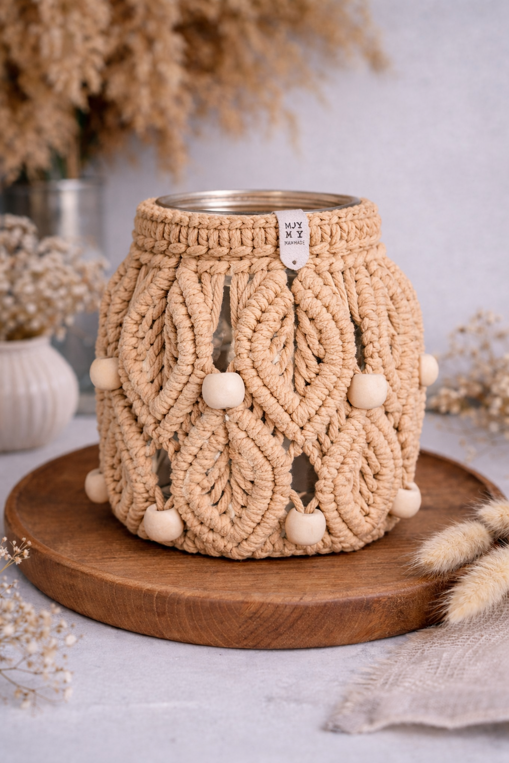 Bring warmth and elegance to your home with this handmade macrame jar lantern. Designed with beautiful knot patterns and wooden bead accents, this decorative jar cover creates a cozy boho atmosphere when paired with a candle or fairy lights.