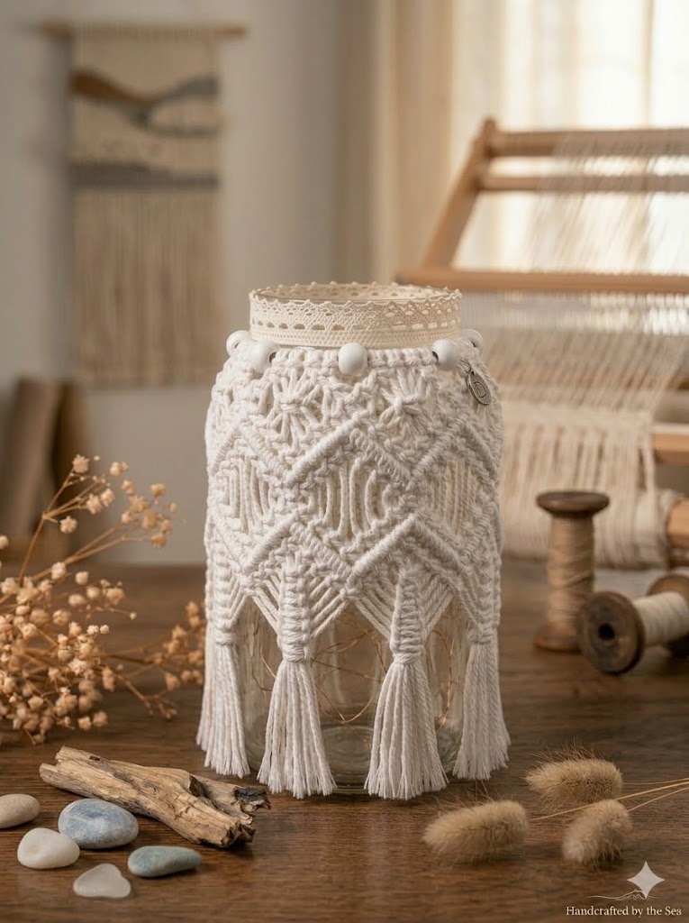 Simply place the macrame cover over a glass jar and add a candle or LED fairy lights to create a cozy lantern effect. The neutral color palette blends perfectly with boho, rustic, minimalist, and modern home interiors.