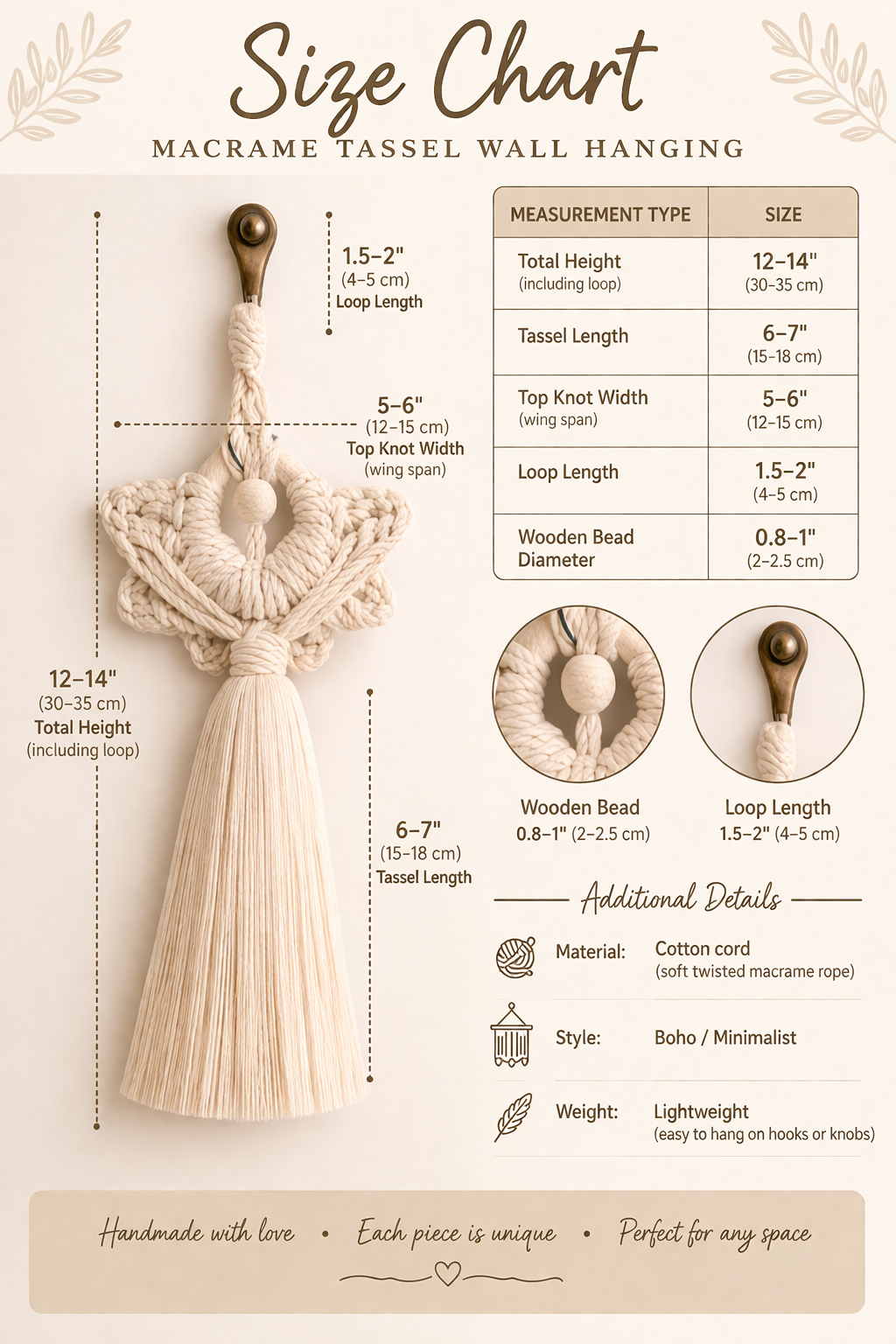 The intricate knotting forms delicate angel wings with a soft flowing tassel, creating a graceful and elegant look. Its neutral beige tone blends effortlessly with boho, minimalist, and modern interiors.