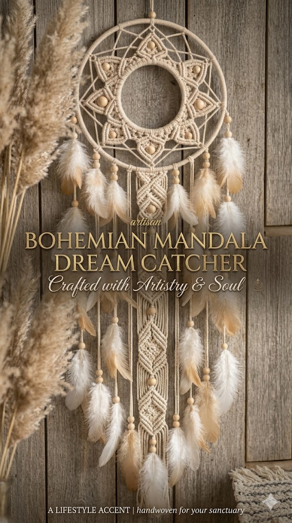 This dream catcher combines macrame weaving, soft feathers, and dual-tone beige & pink colors, making it both decorative and meaningful.