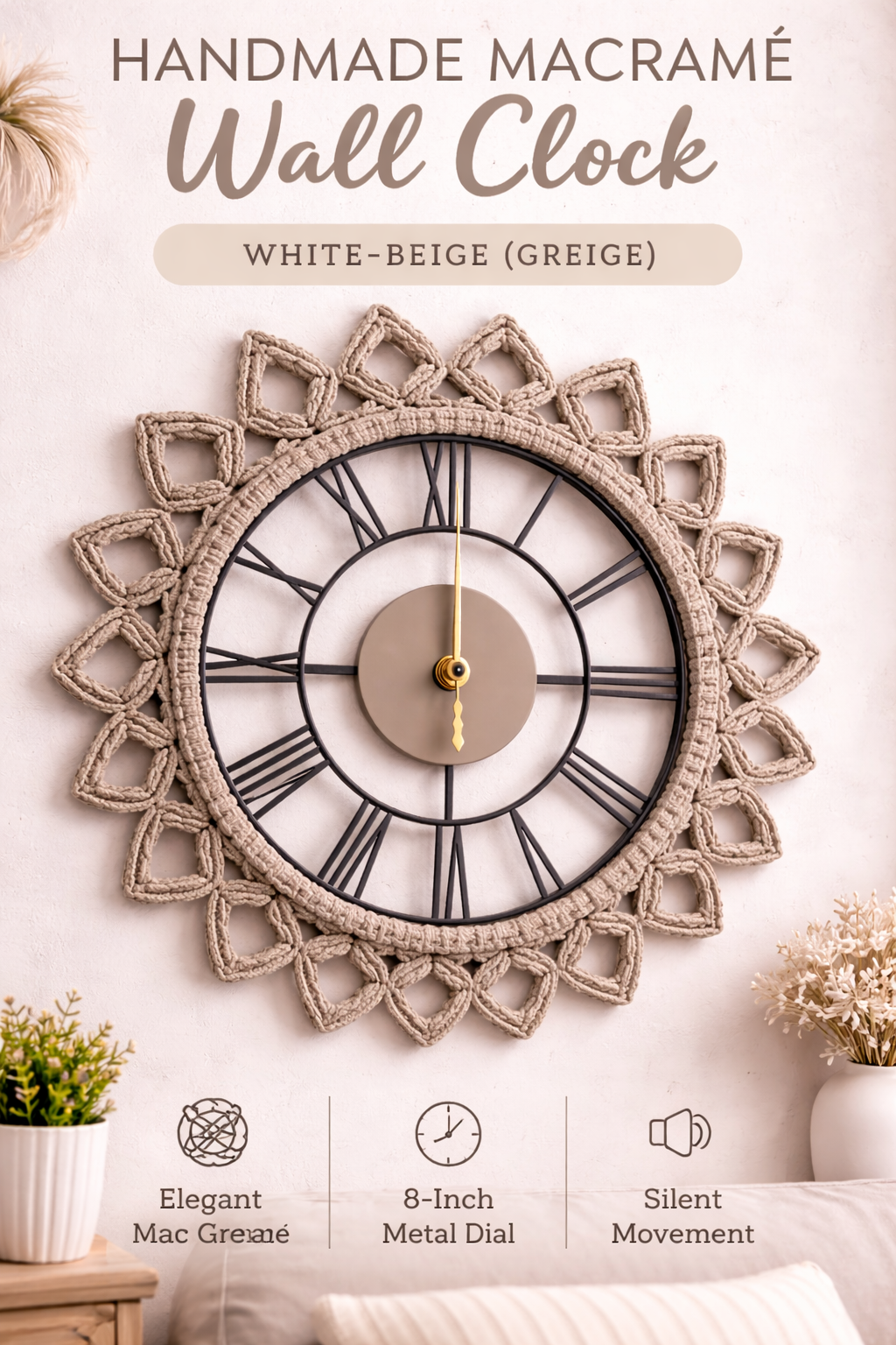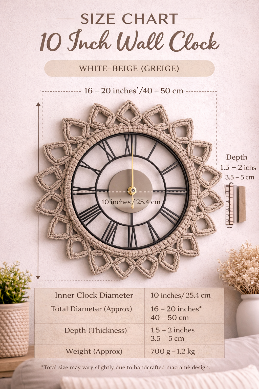 Elevate your space with this white-beige macramé wall clock, featuring a 10-inch dial and elegant handcrafted boho design.