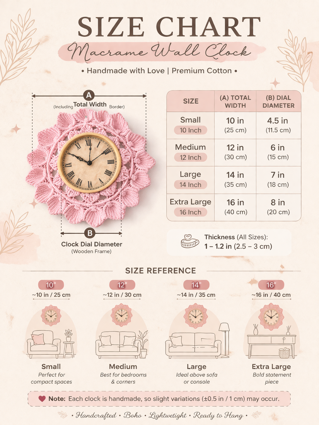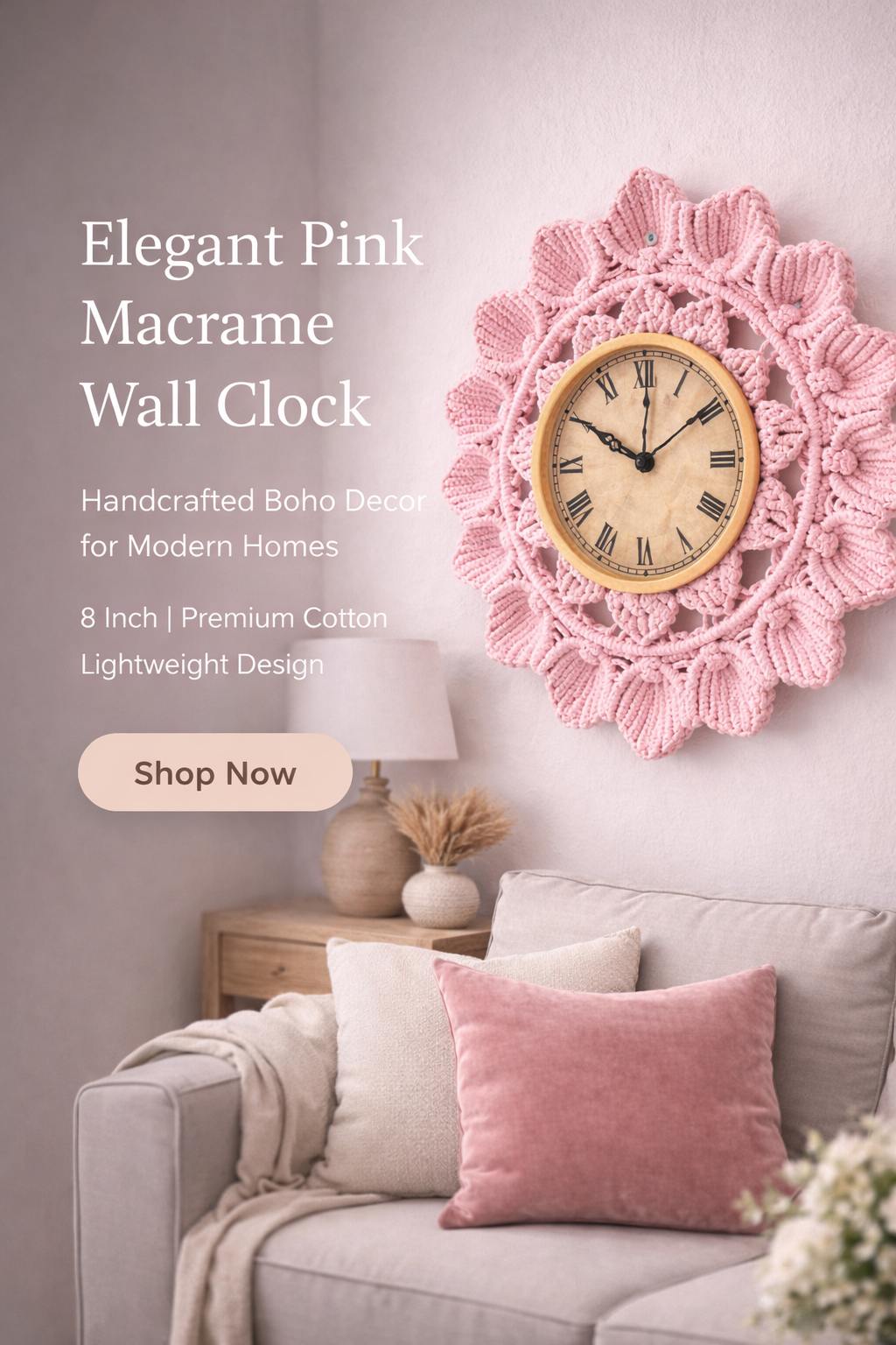 Bring warmth and artistic charm into your home with this beautifully handcrafted macramé wall clock in pink, white, and beige tones. Designed to blend effortlessly with modern and bohemian interiors, this wall clock doubles as a functional timepiece and decorative statement piece.